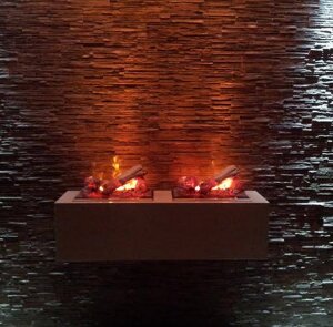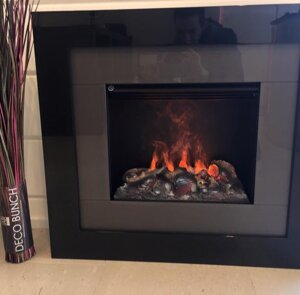 Tecnologia opti-myst by Glen Dimplex : l'effetto tridimensionale utilizza una consolidata tecnologia ad ultrasuoni per creare una finissima nebulizzazione dell'acqua che viene illuminata per creare "fiamme e fumo". Questo, combinato con la legna finta e con un letto di cenere luminoso e scintillante, produce un effetto che supera tutte le aspettative di realismo in un fuoco elettrico.